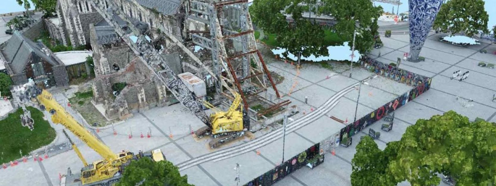 为了协助重建,基督城市议会团队开始了无人机飞行,以捕获地面水平,并提供最新的大教堂广场的正距无人机地图,以允许准确的空间规划。