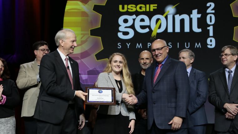 在美国地理空间情报基金会(USGIF)GEOINT 2019年研讨会, Jaclyn Guz被公认为Stu Shea USGIF捐赠奖学金的获得者。古兹是马萨诸塞州伍斯特克拉克大学的一名学生。她正在攻读地理博士学位。该奖学金授予K. Stuart Shea, USGIF的创始人之一,该组织的第一任首席执行官和主席。1.5万美元的奖学金每年颁发给一名研究制图学、地理学或成像科学的博士生。